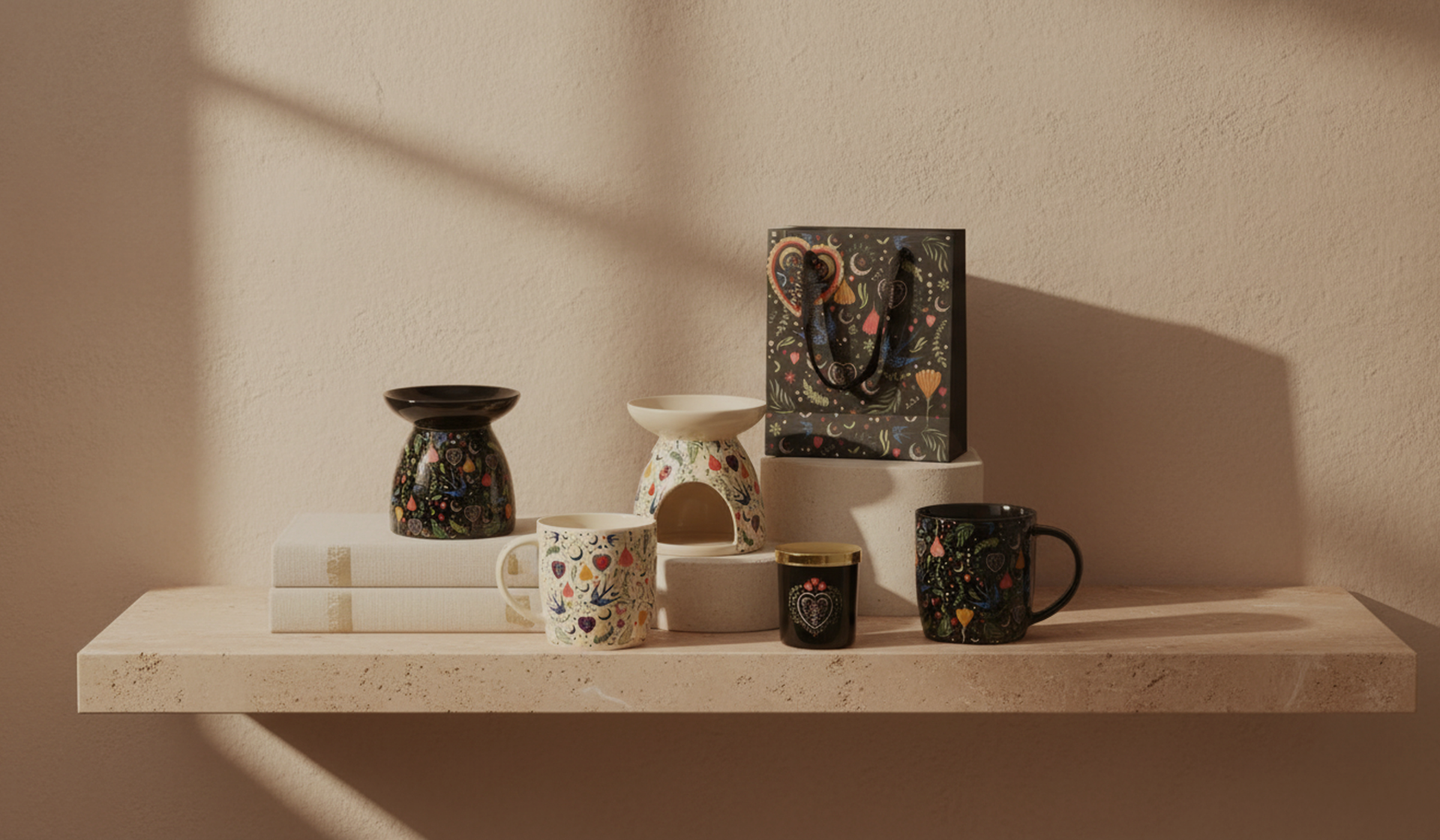 Midnight Bloom blends folk florals with softly atmospheric design, creating ceramics and home fragrance pieces that feel calm, layered and beautifully styled. From mugs to oil burners, this collection adds quiet character to everyday rituals.
